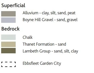Ebbsfleet Garden City is located within two distinct geological zones: the Greater Thames Estuary alluvial clay and the North Kent Plains chalk. Over time the land has been formed by water (e.g. process of erosion and deposition) and human interaction (e.g. the chalk quarries). In a number of places, the chalk bedrock has been exposed and forms a distinctive characteristic of the existing landscape. Additionally, the soil properties and underlying geology are known to effect the infiltration levels of surface water and will have an impact on sustainable urban drainage systems (SuDS).