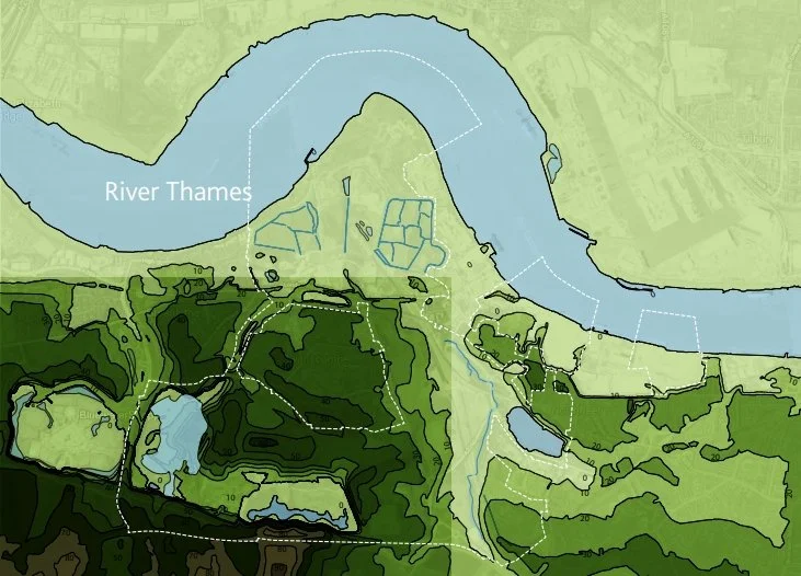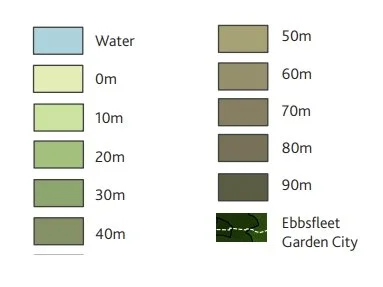 Ebbsfleet Garden City’s topography is characterised by the Ebbsfleet River Valley, the low lying areas along the Thames River bank, and the area’s history of quarry activities. These distinctive topographic features have shaped the Garden City’s hydrology and need to be studied in relationship to proposed sustainable urban drainage systems and planting strategies. Additionally the site’s topography provides opportunities for distinctive viewing points (e.g. from the former landfill in Ebbsfleet Central) and it will need to be used to identify appropriate infrastructural connection points across the Garden City.