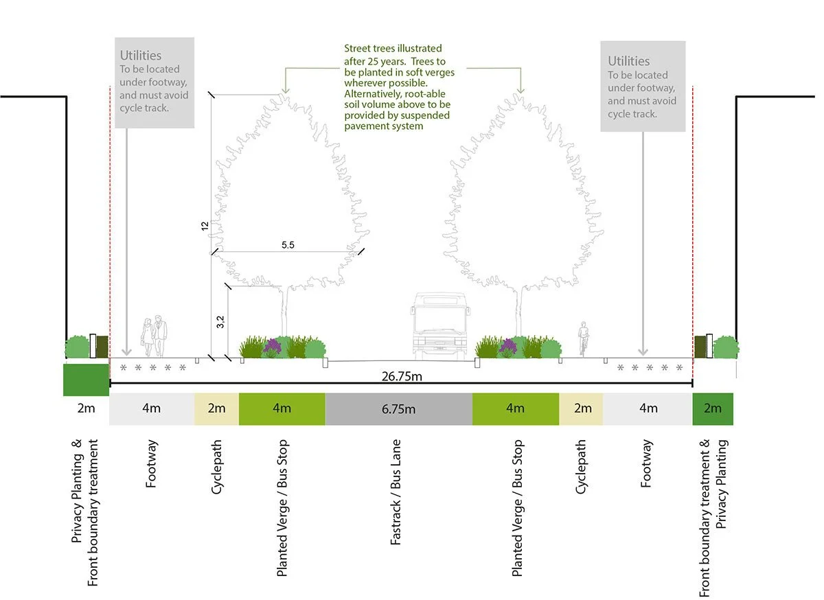 The street layout below shows a worked example for a 50 metre length of the Level1 street typology to demonstrate regulatory compliance, and prove how the street design criteria set out above can be delivered. Applicants can use this layout as a template, or deliver an alternative layout that meets the level 1 street design criteria.